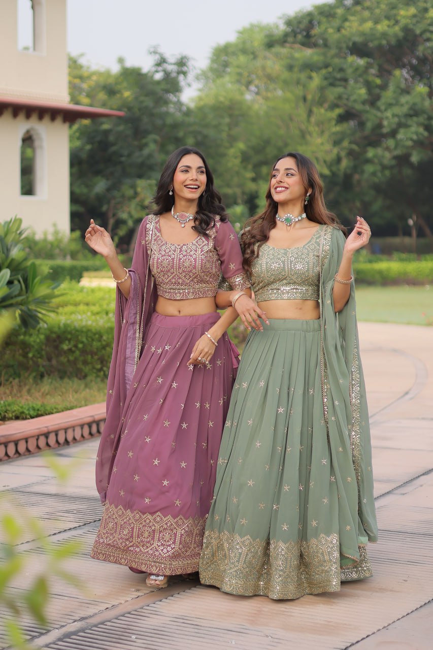 A beautifully crafted women’s lehenga set made with premium faux georgette fabric featuring rich sequins and zari multi embroidery work. This elegant outfit comes with a coordinated blouse and a designer embroidered dupatta, offering a luxurious and festive appeal perfect for weddings, parties, and special occasions.