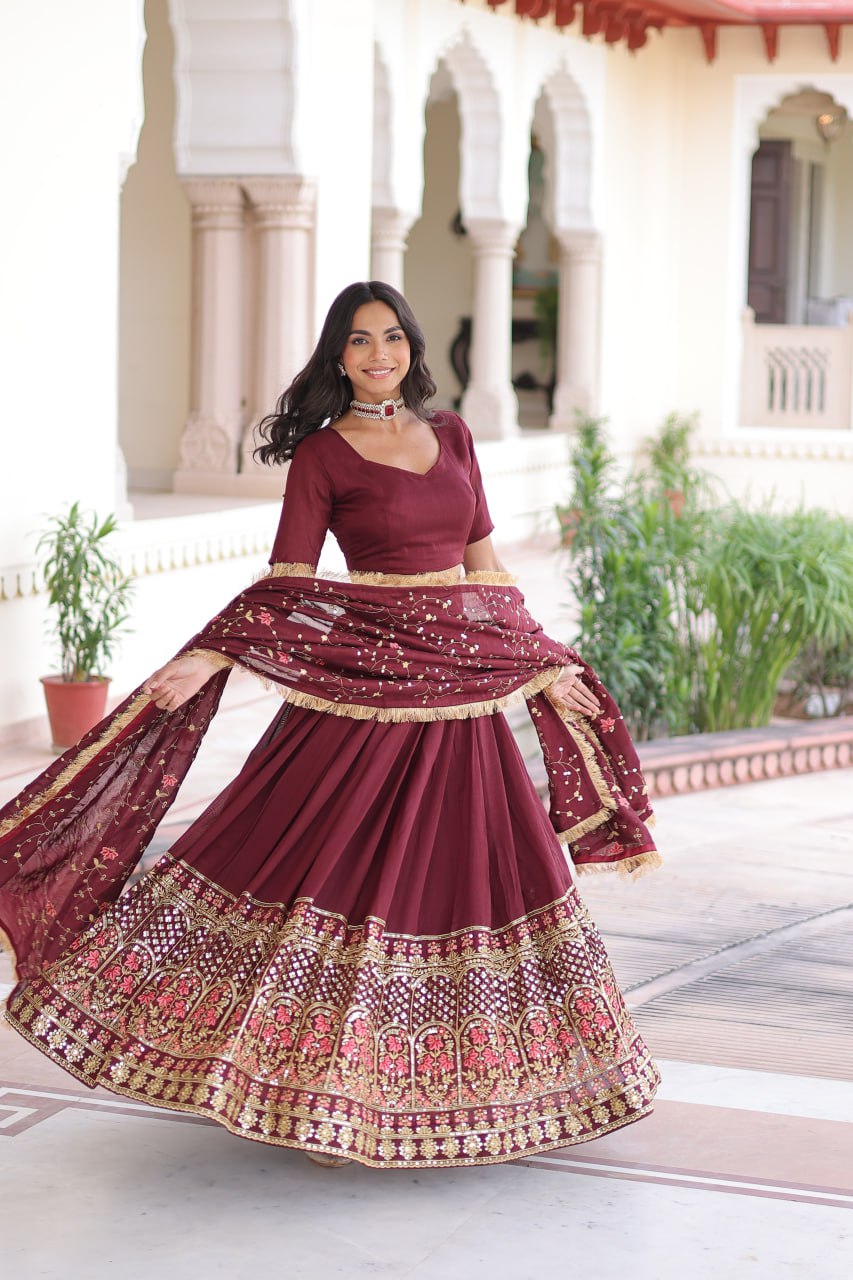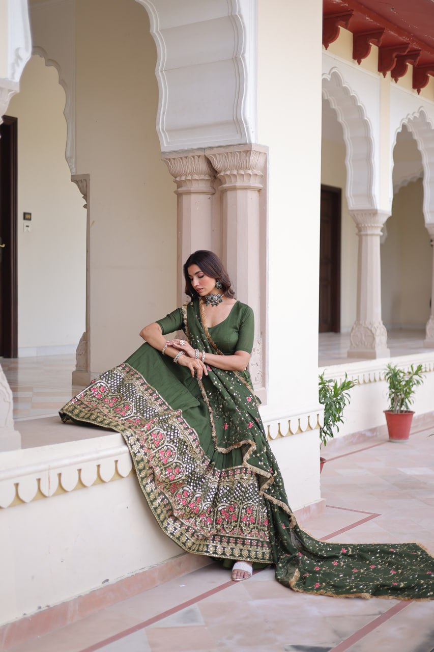 Elevate your festive and wedding wardrobe with our Vichitra Silk Lehenga Choli, a stunning blend of royal craftsmanship and modern elegance. Designed for the woman who loves timeless luxury, this ensemble features rich sequins and intricate thread embroidery, giving it an alluring festive glow.