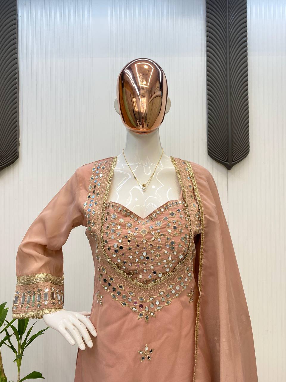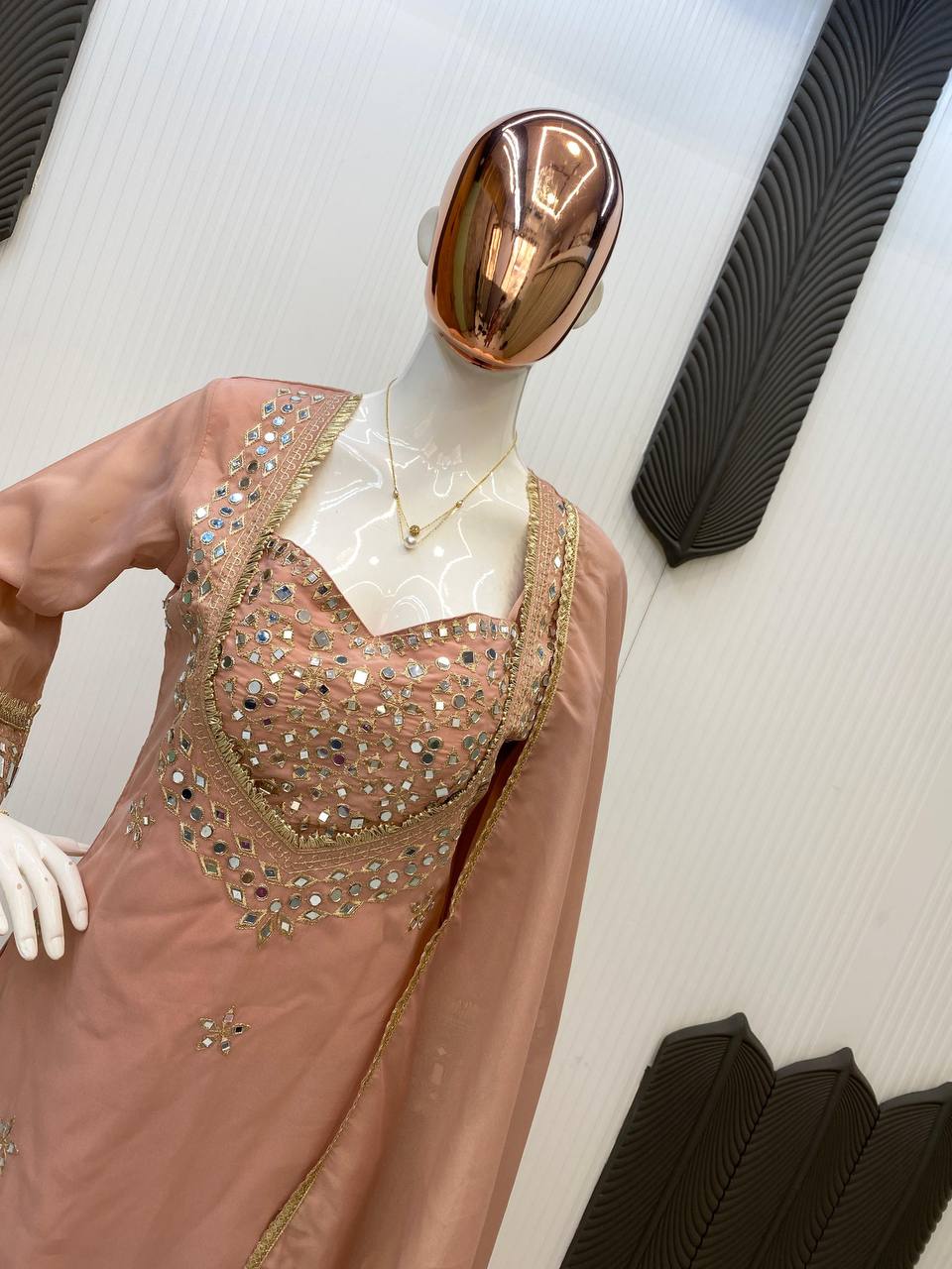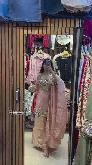 Make a statement with this premium 4-piece plazzo set, designed with intricate real mirror and embroidery work. Crafted from high-quality fabric, this set is perfect for festive occasions, traditional functions, and elegant gatherings.