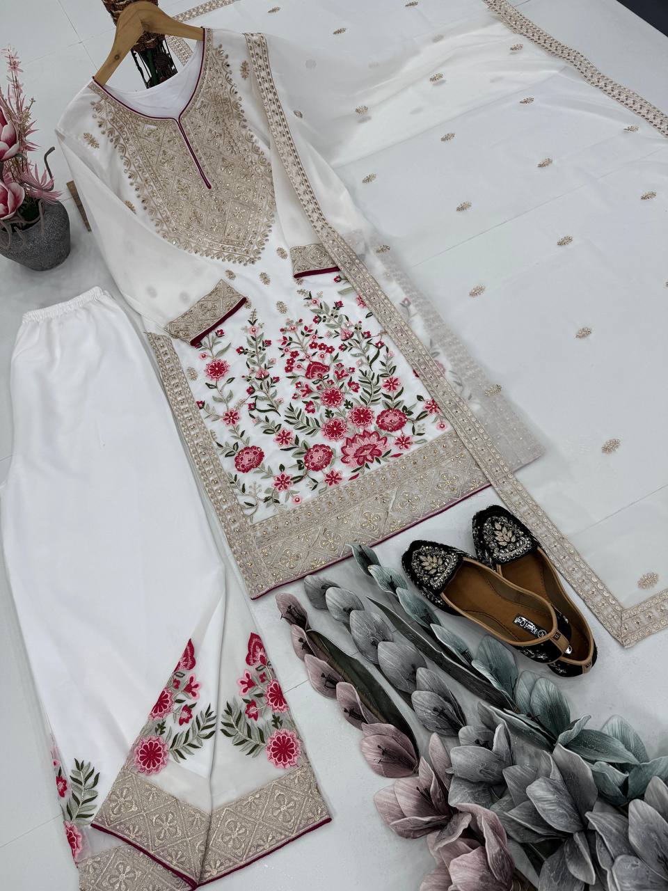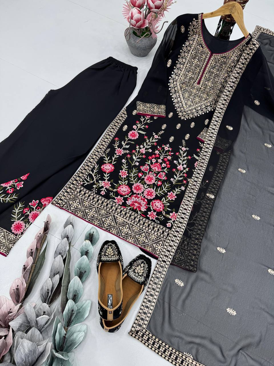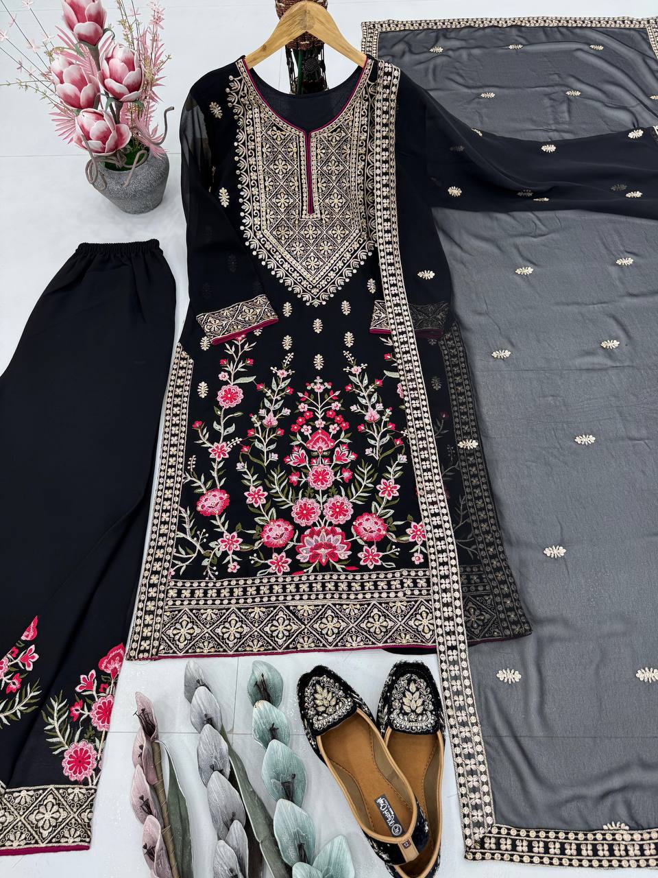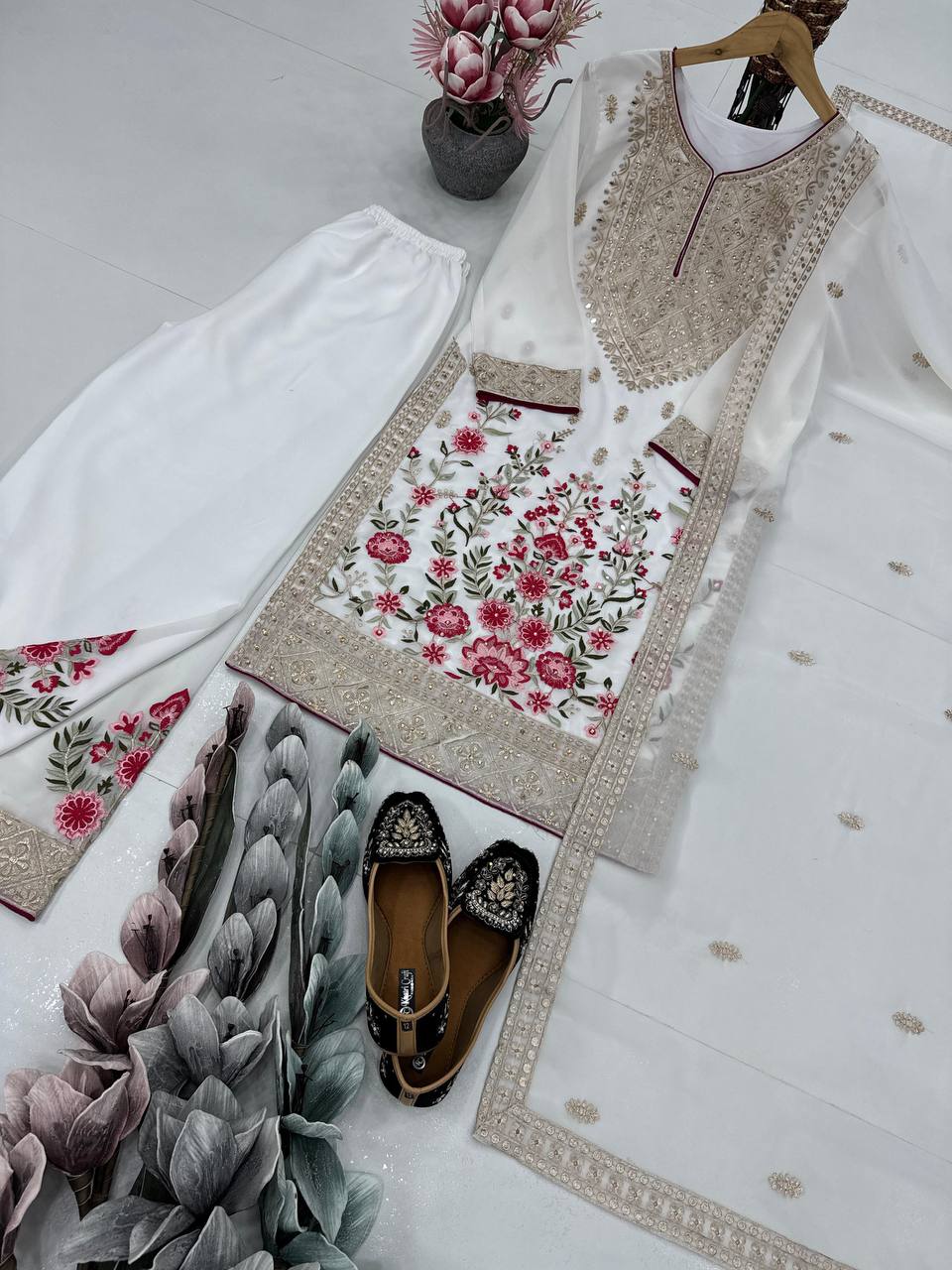 Make a grand statement with this Designer Party Wear 3-Piece Suit Collection, crafted in premium heavy faux georgette fabric. The outfit features exquisite embroidery, sequin detailing, and real mirror handwork, bringing together elegance and festive radiance. Perfect for weddings, parties, and special occasions — this ensemble is a blend of modern style and royal charm.